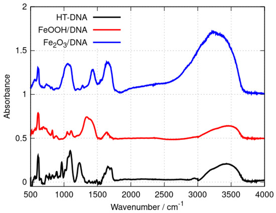 FTIR spectra of (black) HT−DNA, (red) FeOOH/DNA and (blue) Fe2O3/DNA. The absorbances were scaled to be equal for the sharp feature at 611 cm−1 and offset on the y-axis for clarity.