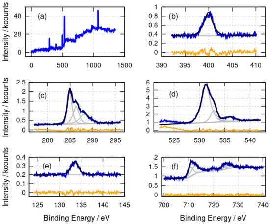X-ray photoelectron spectra of -Fe2O3/DNA. (a) Survey spectrum; (b) N 1s spectrum; (c) C 1s spectrum; (d) O 1s spectrum; (e) P 2p spectrum and (f) Fe 2p spectrum. The experimental data is shown in blue, the fits are shown in black and the individual fitting components are shown in gray. The orange lines are the residuals after fitting.