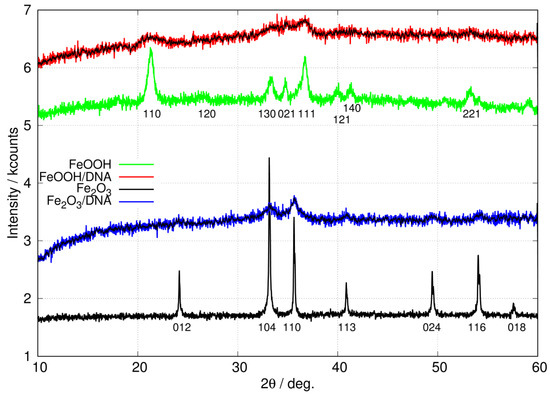 Figure 5 shows the X-ray diffraction (XRD) patterns of the non-templated nanoparticles of FeOOH and Fe2O3 as well as the patterns for the DNA-templated materials, FeOOH/DNA and Fe2O3/DNA. The major peaks for non-templated FeOOH and Fe2O3 nanoparticles are collected in Table 2.