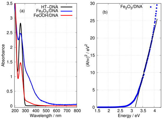(a) UV-Vis absorption spectra in aqueous solution of (black) HT-DNA, (blue) Fe2O3/DNA and (red) FeOOH/DNA. The absorbances of Fe2O3/DNA and FeOOH/DNA were scaled to equal that of HT-DNA at 200 nm. (b) Tauc plot (direct) of the data for Fe2O3/DNA showing eV.