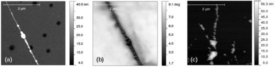 Aligned one-dimensional -FeOOH/DNA and -Fe2O3/DNA structures on Si/SiO2 surfaces were prepared using molecular combing in which a droplet of the sample was dragged across a partially silanised surface [46]. These structures were imaged using atomic force microscopy and the examples are shown in Figure 10. The dendritic structures observed in TEM (Figure 9) are not evident in this case, an observation which we attribute to the forces on the structures arising from fluid flow and interaction with the substrate during combing. A comparison of Figure 9c and Figure 10a suggests that the branches of the structure seen in electron microscopy are wrapped around each other and compacted during the molecular combing procedure used in sample preparation for probe microscopy.
