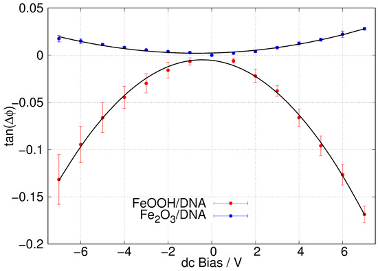 Plots of against dc bias voltage ( = SCM phase angle). The samples were -FeOOH/DNA (red) and -Fe2O3/DNA (blue) aligned via molecular combing on a Si/SiO2 substrate. The lift height was 50 nm. The error bars shown are standard deviations based on N = 5 (red) and N = 4 (blue) measurements.