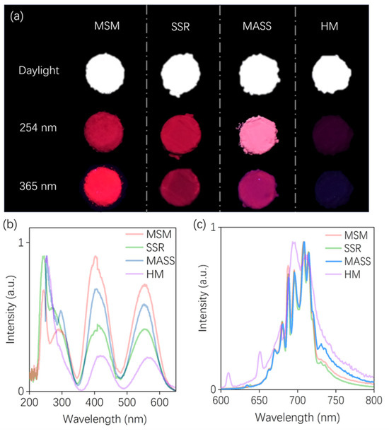 Figure 4a. Samples prepared through MSM, SSR, MASS, and HM emitted deep-red light when exposed to 254 and 365 nm commercial LED irradiation. It is worth noting that the luminescence intensity of the sample prepared by HM is the weakest among these four synthesis methods. To further investigate the effects of different methods on the luminescence properties of ZGO: Cr