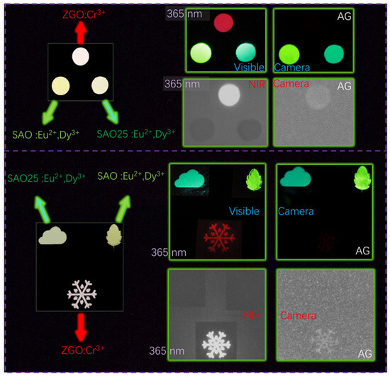 3+ phosphors. Photographs of these patterns were taken by a visible camera under daylight. Also, the pattern under 365 nm LED exhibits bright red, green, and cyan emissions (taken by visible camera). After pre-irradiation by a 365 nm LED for 30 s, the PersL images were also taken by a visible camera. The SAO: Eu