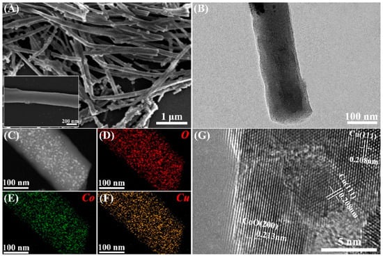 SEM image (A); TEM image (B); HAADF image (C); EDX element mappings (D–F); and HRTEM image (G) of Cu-CoO/C nanoribbon (inset in (A) is the selected enlarged SEM image).