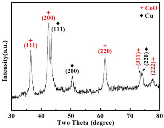 More detailed information about the crystal phases of the Cu-CoO/C nanoribbon was acquired from the XRD measurement. The results shown in Figure 3 demonstrate that there are two characteristic diffraction peaks. The ones marked with red stars presented at 2θ = 36.5, 42.4, 61.5, 73.6 and 77.6°, consistent with (111), (200), (220), (311) and (222) planes, are ascribed to the cubic face-centered phase CoO with cell parameters a = 4.26 Å (JCPDS No. 43-1004). The peaks marked with black diamonds located at 2θ = 43.3, 61.5 and 73.9° can be indexed to the (111), (200) and (220) planes of the cubic face-centered phase Cu nanoparticle, with the cell parameters a = 3.615 Å (JCPDS, No. 04-0836). The result of the XRD pattern demonstrates that both Cu and CoO with high crystallinity were in situ generated in the carbonization process, which is also consistent with the TEM tests.
