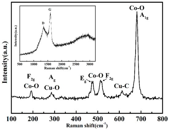 Figure 4 shows the Raman spectra of the Cu-CoO/C nanoribbon. The peaks presented at 192, 473, 515 and 680 cm−1 are in accordance with the F2g, Eg, F2g and A1g modes of the CoO nanoparticle. The peaks at 285 and 613 cm−1 are assigned to the Cu-O and Cu-C bond, respectively [36]. The appearance of these two characteristic peaks can well indicate the existence of copper species, but we cannot verify the chemical composition of copper species based on this. The reason is that homojunction metals have no Raman signal. The XRD pattern confirmed the existence of elemental copper; so, the appearance of Cu-O bonds and Cu-C bonds revealed via Raman spectroscopy may be partially formed by copper ions with molecular oxygen and molecular carbon during carbonization. Moreover, it is worth noting that the Raman characteristic peak on the Ag mode of bulk CuO should appear at 297 cm−1. The reason for the downshift is that the nano-scaled particle has a large effect on Raman peaks due to the rules of crystal momentum conservation, which allows the phonon with wave vector to participate in the first-order Raman scattering; thus, phonon dispersion near the zone center must be taken into consideration [37]. As a result, the Raman peaks will downshift as the particle size decreases. The inset in Figure 4 presents the Raman spectra of the carbon matrix of the Cu-CoO/C nanoribbon, in which two remarkable peaks can be observed at about 1350 and 1590 cm−1. The two peaks are attributed to the D band and G band of carbon material, representing the defects and disorder of local sp3 and the E2g mode of sp2 carbon atoms of graphite. The intensity ratio of D band to G band (ID/IG) can measure the surface defects of carbon material. It can be seen that the ID/IG value of this obtained material is about 0.73, suggesting higher graphitization of the Cu-CoO/C nanoribbon. Some research work has shown that the Raman characteristic peak of multilayer graphene, called 2D band, appears at about 2700 cm−1. Apparently, there is a diffused peak at 2700 cm−1 in the insert Raman spectra; thus, we also attempt to verify whether we obtain multilayer graphene material or not.