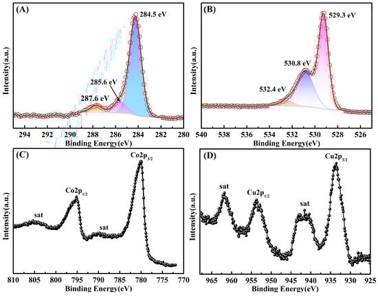 The elemental composition and valence state of metal species were measured via XPS. The C1s spectrum shown in Figure 5A was fitted into three deconvolution peaks, from which we can see that the main peak is located at 284.5 eV, revealing the C-C bond of defect-free graphite [38]. Another two deconvolution peaks located at 285.6 and 287.6 eV are attributed to defect carbon and the C=O bond [39]. The C1s spectrum also reveals high graphitization of carbon matrix, which is consistent with the Raman test. Figure 5B shows the XPS spectrum of O1s of the Cu-CoO/C nanoribbon; there are three deconvolution peaks presented at 529.3, 530.8 and 532.4 eV, which correspond to the lattice oxygen, the oxygen vacancies and chemisorbed oxygen [40]. The percentages of the three oxygen species are about 62.23%, 35.35% and 2.41%. Abundant oxygen vacancies can optimize the adsorption energy of reactants on the catalyst surface, thereby reducing the reaction energy barrier and promoting molecular activation. Figure 5C shows the XPS spectrum of Co2p, with two main peaks presented at binding energies of 780.1 eV for Co2p3/2 and 795.6 eV for Co2p1/2 (the difference value is 15.5 eV), indicating the characteristic of the CoO species [41]. The Cu2p spectrum is shown in Figure 5D; the two spin–orbit doublets located at 933.7 and 953.7 eV are assigned to Cu2p3/2 and Cu2p1/2, as well as the two satellite peaks with binding energies of 942 and 962 eV, indicating the characteristic of the CuO species [42], which suggested the oxidation of Cu(0) on the particle surface.