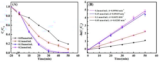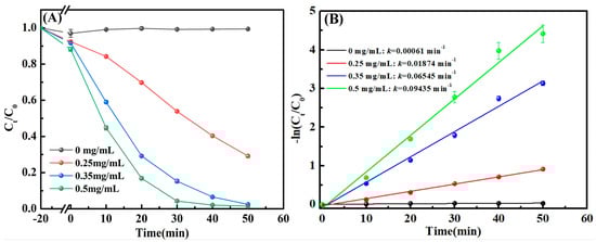 MB degradation curves under different dosages of catalyst (A) and the rate constant (k) estimated using the slopes of the straight lines of −ln(Ct/C0) vs. reaction time (B) (Experimental conditions: MB 0.01 mg·mL−1; H2O2 0.15 mmol/mL; pH = 7 and T = 298 K).