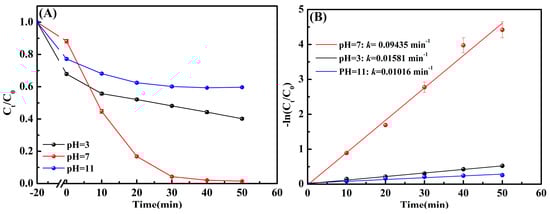 MB degradation curves under different pH values (A) and the rate constant (k) estimated using the slopes of the straight lines of −ln(Ct/C0) vs. reaction time (B) (experimental conditions: MB 0.01 mg·mL−1; catalyst 0.5 mg/mL; H2O2 0.15 mmol/mL and T = 298 K).