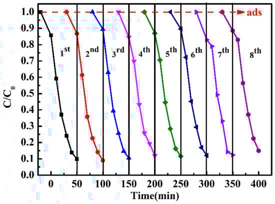 Good cyclic stability is another important index of catalyst. The CoO component endows the composited material with a magnetic property. Figure 9 shows the magnetization curves of the obtained catalyst; the value of saturation magnetization is 110.9 emu·g−1, and the obvious hysteresis loop suggests the ferromagnetic nature of the catalyst. An excellent magnetic property allows the catalyst to be easily separated from the reaction system and used for the next reaction (see inset digital image). We investigated the durability of the Cu-CoO/C nanoribbon under the same condition, and the result shown in Figure 10 indicates that the discoloration rate of MB could still reach more than 85% after eight cycles, suggesting good reusability of this obtained material. Moreover, the concentrations of metal ions leached from the Cu-CoO/C nanoribbon were also detected via ICP; the value of Cu2+ ions was 0.082 mg/L and 1.28 mg/L after one cycle and eight cycles, while that of Co2+ ions was 0.094 mg/L and 2.15 mg/L.