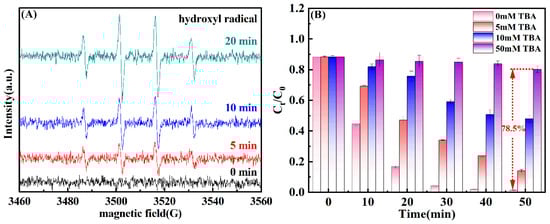 The ESR spin–trap technique was used to explore the oxidative species in the catalysis. As shown in Figure 11A, quartet peaks with a 1:2:2:1 intensity ratio that can be assigned to the signals of ·OH/DMPO adducts present in the Fenton-like system were catalyzed by the Cu-CoO/C nanoribbon, demonstrating the formation of ·OH species. Significantly, the concentration of generated ·OH is increased with the increase in reaction time, suggesting the catalyst can activate H2O2 continuously and quickly to achieve an efficient decolorization of organic dyes. The ·OH species are considered the dominant oxidant in a Fenton or Fenton-like system. A quenching experiment can effectively reveal the role of the ·OH species, and the result shown in Figure 11B indicates that TBA inhibits the discoloration of MB with an increase in the dosage of the scavenger. The MB discoloration was reduced by 78.5% in the presence of 50 mM TBA, which can directly verify the role of the ·OH species in a Fenton-like system catalyzed by the Cu-CoO/C nanoribbon.