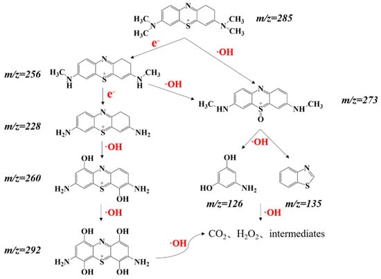 LC-MS was used to explore the possible intermediates of MB discoloration. The result demonstrates that intermediates were mainly generated by demethylation and hydroxylation, which is similar to some reports [46]. The possible pathway of MB degradation is shown in Figure 12, and the peak at m/z = 285 was ascribed to the existence of MB molecule. According to one possible degradation route, the MB molecule is transformed into several fragments with m/z = 256 and 278 in the presence of electrons, namely demethylation. Peaks at m/z = 260 and 292 were detected, which can be attributed to the hydroxylation reaction after demethylation. In addition, ·OH is widely considered the main active species for organic degradation due to its extremely high oxidation potential; thus, another possible pathway is the direct interaction of ·OH with the MB molecule. The fragment of m/z = 273 was recorded, which should be caused by ·OH directly attacking the MB molecule. Additionally, small molecular rings with m/z = 126 and 135 were detected, illustrating the existence of the ring-opening reaction in the process of MB discoloration. Finally, all of the intermediates should be decomposed and mineralized into CO2, H2O, SO42− and NO3−.