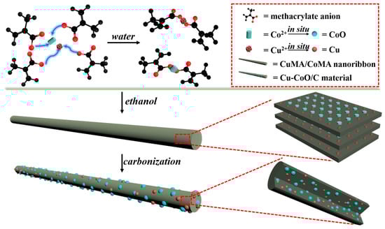 Synthetic pathway for preparing Cu-CoO/C nanoribbon.