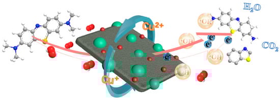 Based on the above discussion, we proposed the possible mechanism of MB discoloration depicted in Scheme 2. The mechanism of heterogeneous catalysis is generally considered to be the process of “adsorption-catalysis-desorption”. In this Fenton-like system catalyzed by the Cu-CoO/C nanoribbon, the adsorption of MB and H2O2 on the surface of the catalyst is the beginning of the whole catalytic reaction. Afterwards, it is well accepted that H2O2 was activated to generate ·OH by a copper species (Equations (1)–(4)) [47]. After that, the ·OH and electrons with high oxidation activity can attack the MB molecule in an aqueous solution (Equation (5)).