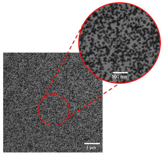 The nucleation and growth of MoS2 on the GaN surface was preliminarily investigated by SEM images collected immediately after the deposition of the samples on different areas. Figure 1 shows a representative image on a 6 μm × 6 μm area, which demonstrates a very dense coverage with MoS2 domains (dark contrast). The insert of Figure 1 allows us to better distinguish the domain’s size and coverage, with typical sizes ranging from 50 to 150 nm and an estimated surface coverage ~35%. Furthermore, the typical triangular shape of these domains can be deduced clearly by a plan view TEM image, as reported in Figure S2 of the Supplementary Materials.