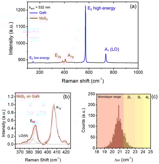 (a) Raman spectrum of the 2D/3D van der Waals heterostructures, showing the GaN and MoS2 vibrational modes by blue and red lines, respectively. (b) Detail on the MoS2 peaks after a deconvolution analysis, which pointed out the presence of a further LO(M) peak at lower wavenumbers. (c) Histogram of the difference between the two peaks (Δω = ωA1g − ωE2g).