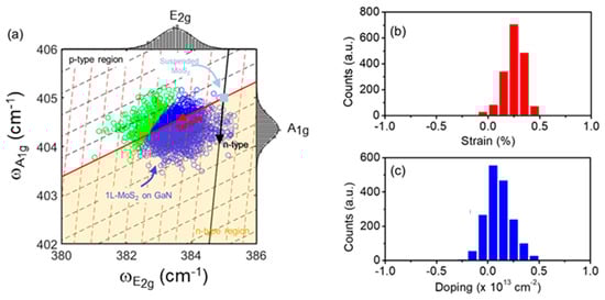 (a) Correlative E2g vs. A1g plot to evaluate the strain and doping effects induced on the MoS2 flakes by the growth conditions and the interaction with GaN substrate. Blue and green points in panel (a) correspond to the peak positions obtained in the 1L and multilayers regions, respectively. Evaluated strain (b,c) doping distributions for 1L of MoS2.
