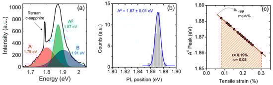 In detail, a deconvolution analysis performed on the spectrum of Figure 5a revealed the coexistence of three components. The A0 and B peaks located at 1.87 eV and 1.91 eV correspond to the excitonic emissions due to the spin-orbit coupling splitting of the MoS2 valence band [77]. Differently, the red-area convoluted peak at lower energy (1.79 eV) is related to the trion (also known as charged exciton) contribution, consisting of the bound state between an electron (or hole) and an exciton [78,79]. This deconvolution analysis confirms the absence of the defect-related peak XD, typically located at lower energy with respect to the trionic component. After a statistical analysis of different MoS2/GaN areas, we built a histogram of the excitonic peak energy A0, as reported in Figure 5b. This distribution showed a standard deviation of 10 meV around a mean value of 1.87 eV, indicating a spatially uniform PL emission from the sample surface. The energy of the main PL peak (A0) has been shown in the literature to be dependent on the strain of MoS2, with a red shift of the peak at increasing strain with a rate of −99 meV/% [72]. By applying this linear relation, the values of the tensile strain were calculated from the experimental values of the A0 peak energy, as reported in Figure 5c. From this analysis, strain values in the range between 0.08 and 0.3% were deduced, with a mean value of ε = 0.19 ± 0.05%, in good agreement with the previous estimation by Raman measurements.