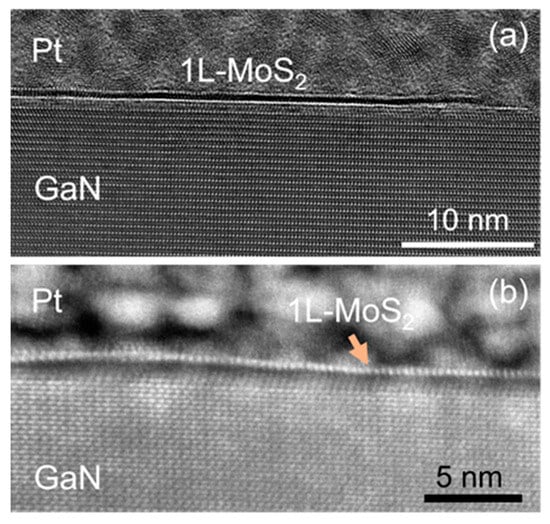 The interface properties of the 2D/3D vdW heterostructure were characterized by cross-sectional transmission electron microscopy analyses. Figure 6a is an overview HR-TEM image, showing a monolayer MoS2 conformal to the crystalline GaN substrate, similarly to other reports for MoS2 grown by CVD approaches on GaN or other crystalline hexagonal substrates [36,37,80,81]. Furthermore, the presence of a vdW gap between the single layer of MoS2 and GaN surface is clearly demonstrated by the high-resolution HAADF-STEM image in Figure 6b. This is a direct indication of a weak bond between MoS2 and the underlying GaN crystal. Notably, this high-resolution STEM analysis reveals a different structure of the first crystalline planes of GaN with respect to the underlying bulk crystal. As reported in previous structural investigations of CVD MoS2/GaN heterostructures [37], such differences can be attributed to partial oxidation of the GaN surface during the MoS2 growth process or some form of surface reconstruction.