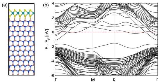 Figure 8a,b shows the results for oxygen-passivated Ga terminations with one monolayer O surface coverage. Also in this case, a covalent interface interaction was obtained, which again deviates from the experimental evidence of a weak van der Waals bonding. The theoretically calculated strong interface coupling had a structural impact only on the topmost Ga layer of the substrate and perturbed the MoS2 bands with respect to those of a freestanding MoS2 layer (see Figure S4 of the Supplementary Materials).