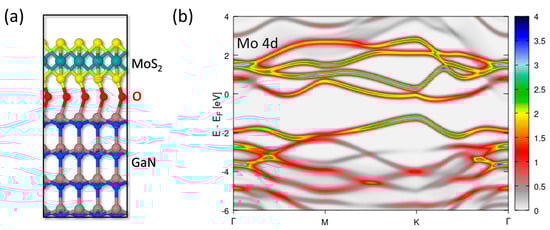 (a) Structure of the MoS2/GaN interface with oxygen passivation of Ga terminations with monolayer O surface coverage, seen from the () plane. (b) Electronic contributions of Mo d orbitals in the wavevector-resolved projected density of states along the Γ-M-K-Γ Brillouin zone path. EF refers to the calculated Fermi level of the system.