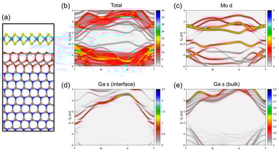 (a) Structure of the oxidized MoS2/GaN(0001) interface, showing the formation of an ultra-thin layer of native oxide Ga2O3, seen from the () plane. Wavevector-resolved projected density of states along the Γ-M-K-Γ Brillouin zone path for (b) all electronic states, (c) contributions of Mo d orbitals, (d) contributions of surface Ga s orbitals, and (e) contributions of bulk Ga s orbitals. EF refers to the calculated Fermi level of the system.