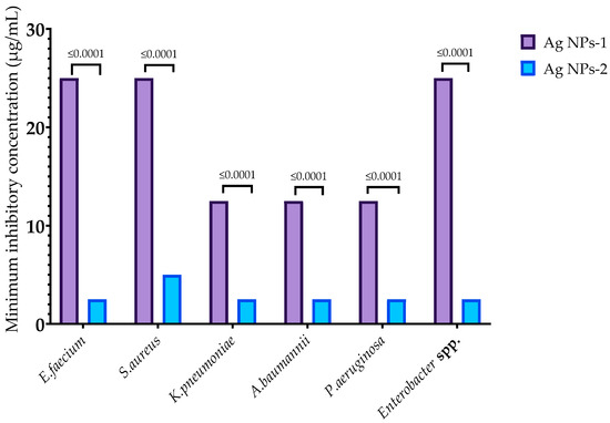 In this study, AgNPs-1 and AgNPs-2 were used for the investigation of their antibacterial activity against multi-resistant clinical strains of Enterococcus faecium, Staphylococcus aureus, Klebsiella pneumoniae, Acinetobacter baumannii, Pseudomonas aeruginosa, and Enterobacter spp. Both samples were effective against all pathogens. MIC of examined nanoparticles varied from 2.5 to 25 µg/mL (Figure 2). MICs of AgNPs-2 were significantly lower than for AgNPs-1. However, there was no strict correlation between the NP activity and the structure of bacteria cell walls (Gram-negative or Gram-positive germs).