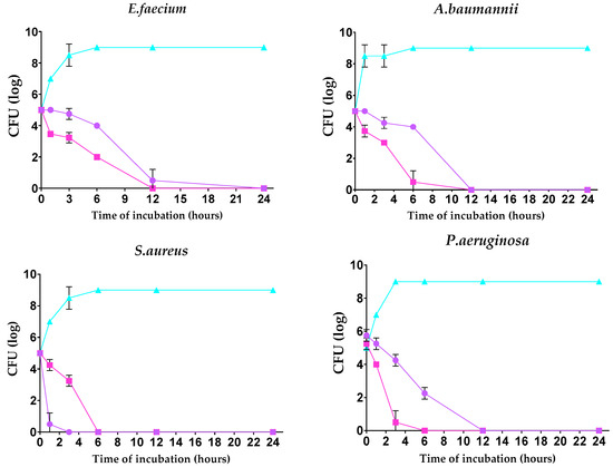 Time-dependent bactericidal activity of the tested silver nanoparticles against ESKAPE pathogens (log CFU/h).