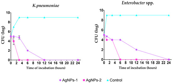 Another important aspect of this work was to analyze the minimum time necessary to reach bactericidal effect. Several studies have shown that the effect of AgNPs is time-dependent [25,36]. Different reports demonstrated the entire mortality in four [44] or eight hours of incubation at MIC [48]. The current study found that AgNPs-2 inhibited the growth and reproduction of the most number of isolates faster than AgNPs-1. In general, these data align with previous results and support the hypothesis that the antimicrobial activity of AgNPs might be linked to NP’s particular features, such as zeta potential and level of ion release.