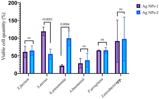 The anti-adhesion activity of AgNPs against ESKAPE pathogens (p-value is above the bars, ns—nonsignificant difference).