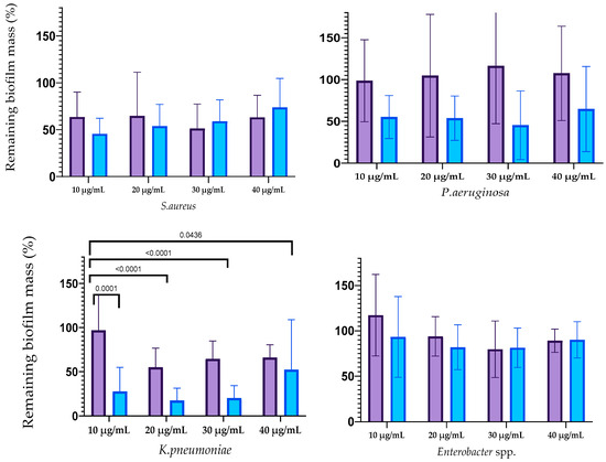 The influence of silver nanoparticles on mature biofilm mass is reflected in Figure 5. The destruction of biofilms formed with E. faecium was caused by AgNPs-1 at all concentrations and AgNPs-2 at a concentration of 40 µg/mL. The biofilms formed by S. aureus were destroyed with AgNP-1 and AgNPs-2 at all concentrations. The efficacy of AgNPs-1 and AgNPs-2 in disrupting mature biofilm mass varied among the tested Gram-negative bacteria. Specifically, AgNPs-1, at concentrations ranging from 20–40 µg/mL, was effective only against the biofilm formed by K. pneumoniae. In contrast, AgNPs-2 demonstrated a variable degree of effectiveness in disrupting the biofilms of all tested Gram-negative microbes, including A. baumannii, P. aeruginosa, K. pneumoniae, and Enterobacter spp. However, the significant difference between AgNPs-1 and AgNPs-2 activity was detected only against K. pneumoniae biofilm.