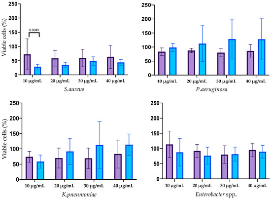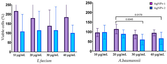 The results of the biofilm cells’ viability after silver nanoparticle treatment are shown in Figure 6. The effect of AgNPs on the biofilm cells of E. faecium was not revealed. Cell viability in mature biofilms formed by S. aureus was decreased by treatment with both types of AgNPs at all concentrations with a statistically significant difference at concentration 10 µg/mL. AgNPs-2 caused the statistically reliable decline of the A. baumannii biofilm viability at a concentration of 30–40 µg/mL. There was a slight decrease in the viable cell count in the biofilm formed with K. pneumoniae, P. aeruginosa, and Enterobacter spp. At the same time, the ANOVA (one way) did not show a significant difference between AgNPs-1 and AgNPs-2 activity.