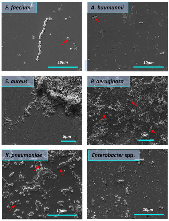 All bacteria in the control group formed the structured biofilms. S. aureus biofilms were dense and highly hydrated, with clusters of bacterial cells enclosed in a matrix composed of exopolysaccharides. In the control group (Figure 7), we observed the E. faecium biofilm biomass as a monolayer with visible 3D architecture. E. faecium biofilm was embedded into the EPS wrapping. The biofilm formed by A. baumannii in the control sample was characterized by the presence of pili or cellular filaments between bacterial cells. A similar picture was found in the case of the K. pneumoniae where biofilm was presented as cell-associated bacterial clusters. SEM micrograph of the Enterobacter spp. bacteria in the control group showed the aggregation and cohesion of the cells with visible intimate contact between bacteria and the surface. Biofilm architecture of untreated P. aeruginosa biofilm appeared as aggregated rod chains by pili.