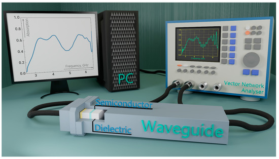 We have developed an experimental setup for the comparative analysis of experimental and numerical results, as shown in Figure 1. The central element of the experimental setup was a closed-type waveguide system with two ports for the supply and detection of electromagnetic radiation. To build a closed-type waveguide system, we used two coaxial waveguide junctions (CWJ) and a waveguide, the length of which is 50 cm; the internal size of the CWJ and the waveguide is 5.8 × 2.5 cm, and the operating frequency range in the single-mode radio wave propagation regime is from 2.5 to 6 GHz. A vector network analyzer (VNA), S5085 [48], was used as a source and detector of electromagnetic radiation, with two CWJs connected to its ports. The VNA was calibrated with the coaxial cables (CCs) before the output of the coaxial cable connector using the 6550F18-F calibration standard kit (full two-port calibration) to eliminate the influence of the CCs on the input and detected electromagnetic radiation.