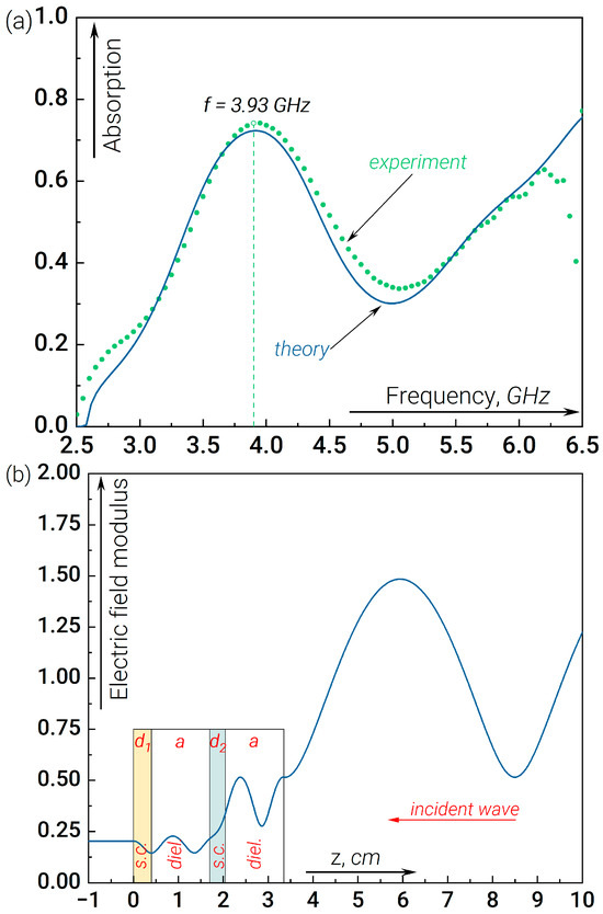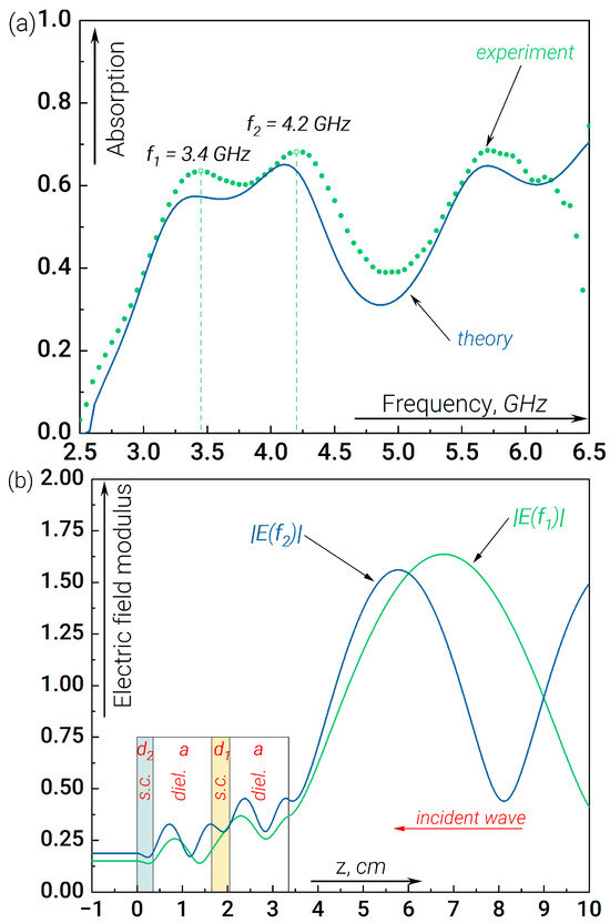 Another part of the work is devoted to investigating the possibilities of controlling the fraction of the signal absorbed as well as the absorption bandwidth, which is important for the detection of broadband signals. To this end, we have studied the characteristics of the resonant absorption of radiation in the presence of four-layer structures whose dielectric permittivity is described by Formulas (4) and (5). The measured and simulated radiation absorption data for structure (4) are shown in Figure 3. A significant increase in the fraction of the absorbed signal can be observed compared to the previous case, as well as a slight shift in the resonance frequency (Figure 3a). In this case, the resonance condition (three half-wavelengths) is fulfilled independently for both dielectric plates (see Figure 3b). By contrast, the dielectric plate located between the two semiconductors acts as a “booster”, providing effective penetration (and absorption) of the wave field inside the far (concerning the incident wave) semiconductor plate (plate “1”). Nevertheless, it is clear from Figure 3b that the value of the field distribution in the left dielectric plate is considerably lower than in the right one, so the absorption is mainly determined by the semiconductor plate “2”, which is placed closer to the incident wave. Of note, this version of “anti-reflection coating” with good matching of “distributed detector impedance” to “open space impedance” provides a noticeable increase in absorption.