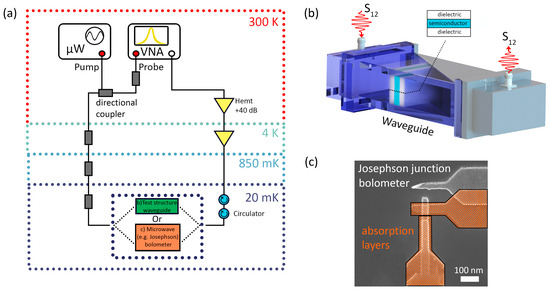 (a) The proposed measurement scheme for mK temperatures. (b) Sketch of a cryogenic waveguide that will be used to test the results obtained at low temperatures. (c) An example of a key part (superconductor–insulator–superconductor tunnel contact) of a Josephson microwave photon detector whose sensitivity will be enhanced by the use of an anti-reflection coating designed for experimental conditions (with appropriate relatively high dielectric constant, appropriate dimensions, etc.). Here, we have two superconducting electrodes (absorption layers) separated in the overlap region by a thin “tunnel” dielectric layer; the absorption of microwave photons leads to a transition to a new (resistive) state of the entire nanostructure, and the proposed anti-reflection coating will increase the efficiency of the detector’s interaction with the field in this case as well.