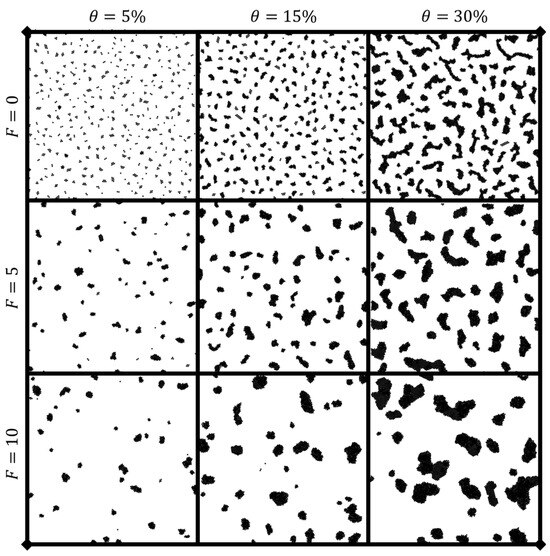 Recent research has demonstrated that the directed assembly of colloidal dispersions can be used to synthesize a diverse range of functional materials in a controlled fashion [51,52,53]. While self-assembly is inherent to passive colloids, systems composed of active particles exhibit an augmented capacity for self-assembly, due to the driven nature of these particles [54,55]. This type of active aggregation has been shown to create dynamic clusters that evolve over time, propelled by both fluid velocity and the individual motion of active particles. This mechanism effectively overcomes the long-range repulsion commonly observed in colloidal systems [56,57]. The aggregation of active colloidal particles has been shown to occur naturally in systems with colloidal volume fractions ranging from to [58]. The complexity of active particle aggregation is noteworthy, with behavior resembling living cell aggregates emerging as active colloids self-organize into clusters [59]. Motility-induced clustering and phase separation have been demonstrated in quasi-2D environments [60]. Under weak confinement, autophoretic active particles exhibit both clustering and dispersion modes, dependent on the driving force and interparticle interactions [61]. In many cases, the presence of geometrical confinement grants far different dynamics to active particles as compared to the more widely modeled unbounded cases, highlighting the importance of considering explicit confinement when modeling non-bulk systems [62,63]. The presence of physical or other manner of confinement has a profound effect on the behavior of active particles, as the existence of a boundary introduces complexity to the motion of the driven motors, leading to phase separation, boundary clustering, and other emergent behaviors [64,65,66,67]. Confinement also serve as a tool for predicting and controlling the behavior of active particles such as micromotors [68]. Active colloidal particle aggregation has been shown in previous works in the literature to be heavily dependent on the size and surface properties of the particles [69,70]. In addition, the application of external electric or magnetic fields can also drive the aggregation process [51,71]. However, there remains a lack of research towards the confined collective behavior of active colloids, specifically covering a range of volume fractions and driving forces, especially as it relates to their aggregation [72,73,74]. Consequently, the micrometer-scale behavior of active particles, especially within confined systems, warrants comprehensive investigation, in order to supplement the rapidly growing literature on computational methods for modeling active matter [75].