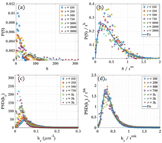 Cluster dynamics over time for , . (a) The cluster size distributions for to . (b) The same cluster size distribution after being scaled by the scaling function for the pertinent region. (c) The circularly averaged FFT spectra for to . (d) The same spectra after being scaled by the scaling function for the pertinent region.