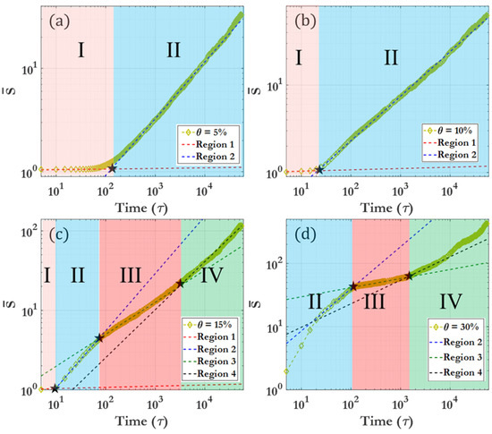 Demonstration of fitting curves for the average cluster size and the associated different dynamic regions for (a) , (b) , (c) , and (d) . for all cases shown. The intersection points of fitting curves are denoted by asterisks.