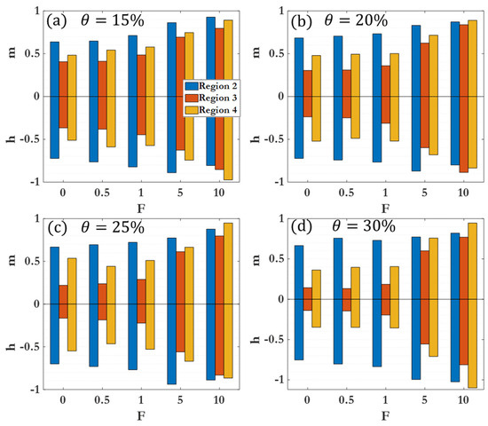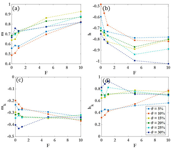 Scaling exponents (negative) and (positive) for different dynamic regions. (a) Results for at different ; (b) results for at different ; (c) results for at different ; (d) results for at different .
