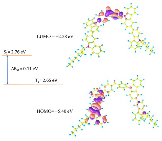 Theoretical calculations were carried out to establish a relation between the electrochemical properties and geometries of the synthesized compounds. All calculations were carried out using Gaussian09.0D [29]. The polarizable continuum model, which Gaussian09 uses by default, was employed for the solvent adjustments [30]. In all compounds, HOMO was found to be located over the peripheral carbazole units, while LUMO was found to be spread over the central benzophenone unit. The HOMO/LUMO distributions ensure that the present molecules have donor-acceptor characteristics, in which carbazole units act as donor units and benzophenone acts as an acceptor unit. The values of HOMO/LUMO were theoretically calculated to be −5.39/−2.28, −5.40/−2.28, and −5.40/−2.26 eV for DB14, DB23, and DB29, respectively. Further, the singlet and triplet energies were very crucial for the designed emitters to evaluate their potential for optoelectronic devices; hence, the singlet and triplet energy levels of all synthesized compounds were established through TD-DFT calculations. All compounds showed high triplet energies of about 2.65 eV, which indicated that these molecules have the potential to be used in the emitting layer of OLEDs. The HOMO/LUMO and singlet/triplet energies of DB23 are shown in Figure 1. Similarly, the theoretical results for DB13 and DB29 are presented in Figure S1 of ESI. All theoretical results are also tabulated in Table 1.