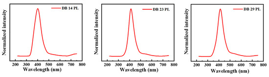 For the measurements of photoluminescence, the maxima absorbance wavelengths were employed as the wavelengths for excitation, which are shown in Table 1. In Figure 3, the photoluminescence (PL) spectra of the derivatives DB14, DB23, and DB29 are depicted. They show very similar emission bands for all compounds with maxima wavelengths of approximately 400 nm due to the similar electronic structure of the derivatives.
