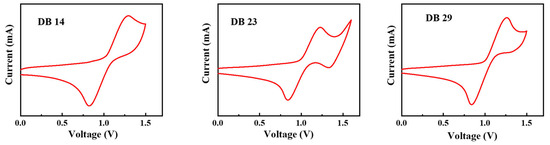 Curves of CV scans of the molecules DB14, DB23, and DB29.