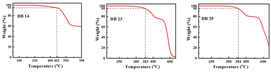 Curves of the TGA measurements of the materials DB14, DB23, and DB29.