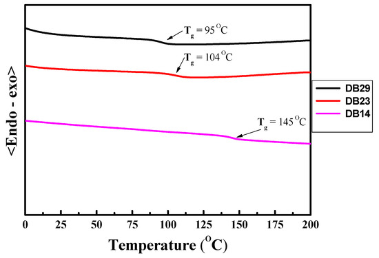 DSC curves of second heating of the materials DB14, DB23, and DB29.