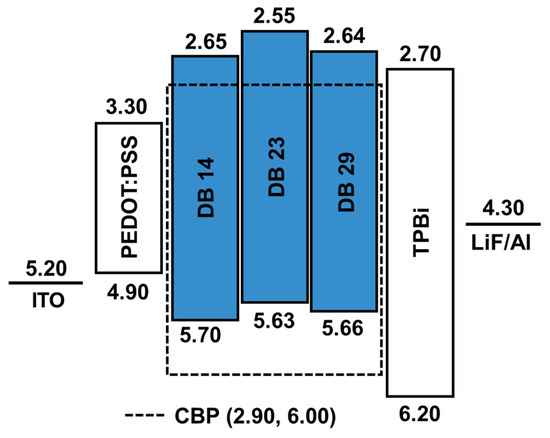 The calculated HOMO levels were −5.70, −5.63, and −5.66 eV, while the corresponding LUMO levels were −2.65, −2.55, and −2.64 eV for the DB14, DB23, and DB29 compounds, respectively. These values along with the earlier bandgap measurements are presented in Table 1. It could be stated that the HOMO and LUMO levels of the compounds are found to be suitable for blue-emitting layers using the earlier-mentioned CBP host material.