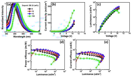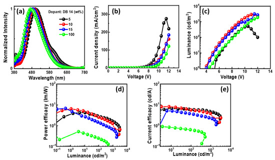 In Figure 10a, the EL spectra of the OLEDs with DB14 exhibit peaks around 480 nm, indicating blue emission. The presence of sole peaks implies the successful energy transfer between host and guest. The emission wavelength in the EL of the devices undergoes a shift when compared with the PL spectra of the DB14 emitter, indicating the influence of the CBP host on emission. An evident emission spectrum of the emitter becomes apparent with an increase in the concentration of the DB14 dopant. Notably, both non-doped and doped devices exhibit very similar EL emission peaks. In Figure 10b–e, the current density–luminance–voltage and power efficacy–luminance–current efficacy characteristics are depicted. The non-doped device exhibits a significantly lower efficacy compared to the doped devices, highlighting the substantial role of the host material. Consequently, a device based on a 10 wt% doping concentration surpasses others in terms of power efficacy, showcasing a PEmax of 4.4 lm/W, a CEmax of 7.6 cd/A, an EQEmax of 3.3%, and an Lmax of 3175 cd/m2 at a turn-on voltage of 5.1 V.