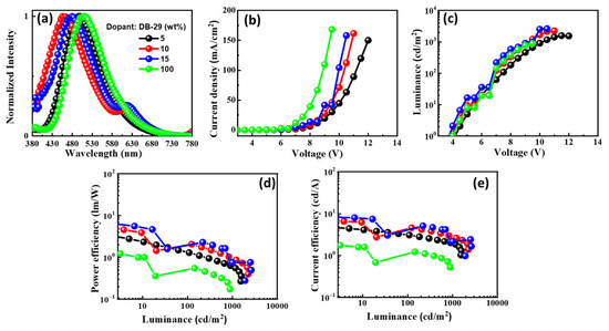 The EL characteristics of the OLEDs with emitter DB29 doped in CBP host material: (a) EL spectra, (b) current density–voltage, (c) luminance–voltage, (d) power efficacy–luminance, and (e) current efficacy–luminance characteristics.