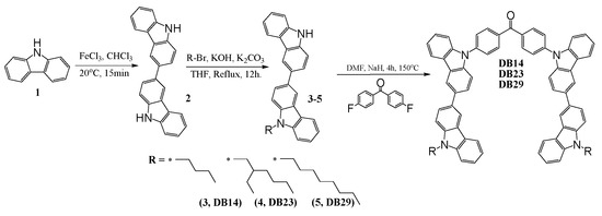 3,3′-Bicarbazole (2) was synthesized through the oxidation of 9H-carbazole (1) using iron (III) chloride, as is described in the ESI file. Various 9-alkyl-9′H-3,3′-bicarbazoles (3–5) were prepared via N-alkylation reactions between a bicarbazole and the corresponding alkyl bromides, utilizing potassium hydroxide and potassium carbonate in tetrahydrofuran (THF). The next step involved the nucleophilic aromatic substitution of partially alkylated bicarbazole with 4,4′-difluorobenzophenone. This reaction was conducted in DMF, employing sodium hydride as a base, yielding the desired materials. This multi-step process resulted in the successful synthesis of the targeted bicarbazole-based compounds. The values of glass transition temperatures are influenced by the distinct alkyl chains in the chemical structures of materials DB14, DB23, and DB29. The derivative DB14, characterized by the shortest butyl alkyl chain, exhibited the highest glass transition temperature at 145 °C. The elongation of the alkyl chain led to decreased but still suitable Tg values for device forming, with DB23 and DB29 showing temperatures of 105 °C and 95 °C, respectively, as verified by DSC.